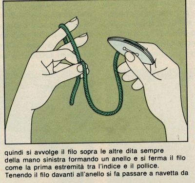 Infilate l'ago senza tagliare il filo dal gomitolo. Tenetelo insieme al filo con l'indice e il pollice della mano destra a distanza di circa 30 cm dall'inizio. Avvolgete il filo che proviene dal gomitolo intorno all'indice della mano sinistra (fig. 1). Eseguite il nodo seguendo le fig. 2 e 3. Bloccatelo sull'ago con l'indice della mano destra e continuate a fare i nodi finché non avrete memorizzato bene l'esecuzione.